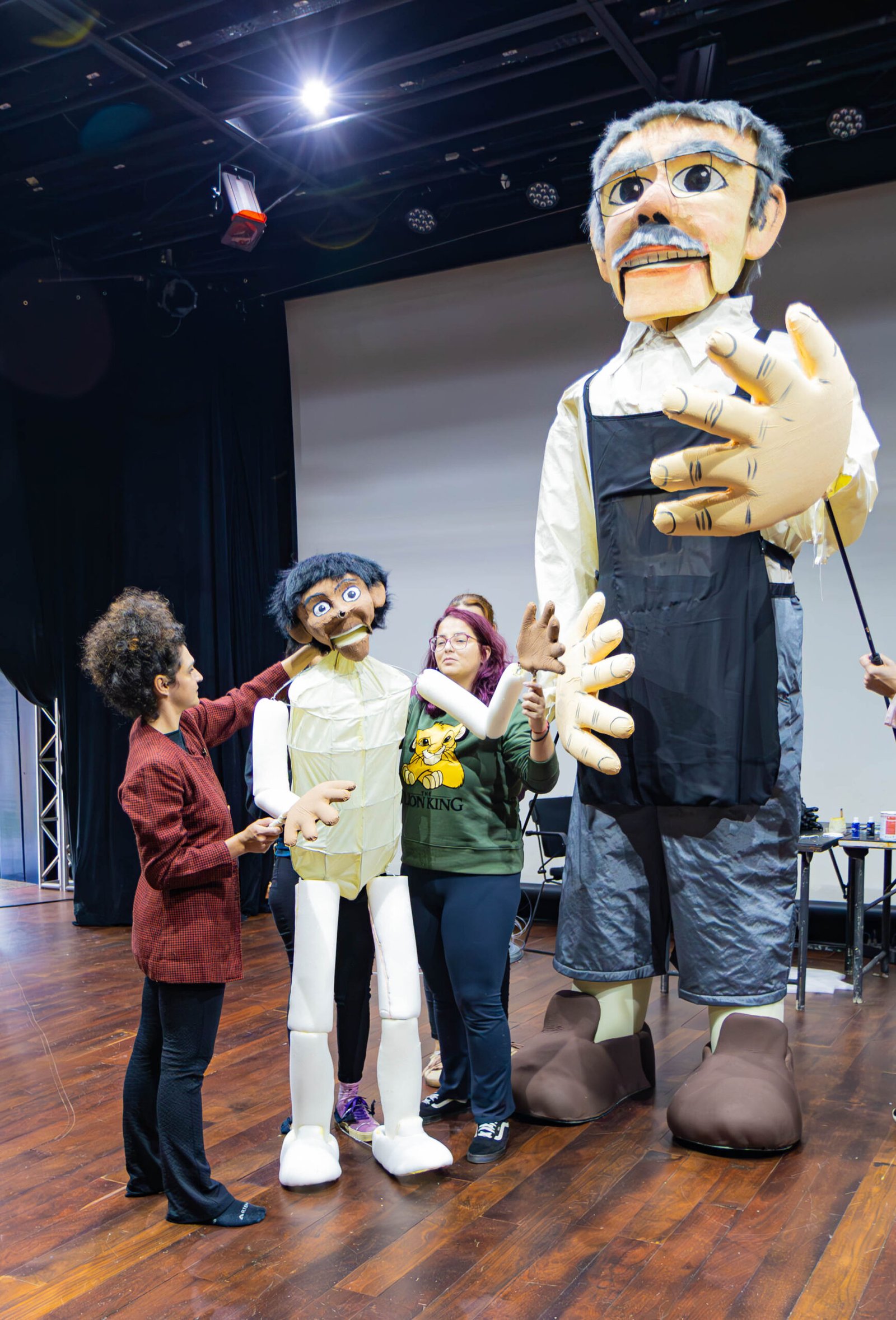 Nesta intervenção teatral itinerante, os personagens clássicos Gepeto e Pinóquio surgem em espaços públicos, festivais e eventos culturais, convidando o público a participar de jogos cênicos, brincadeiras e momentos de improviso. Inspirada na tradicional história do boneco que sonha em se tornar um menino de verdade, a ação mistura teatro, animação e interação direta com o público, aproximando crianças e adultos do universo dos contos clássicos e do teatro de bonecos.